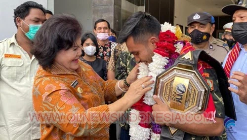 Bupati Karo, Cory S Sebayang sambut kedatangan Eperaim Ginting yang berhasil meraih Juara Baru di kelas Featherweight One Pride MMA dilaksanakan di Kabanjahe persinya di halaman Kantor Bupati Karo, Kamis (31/03) sore.