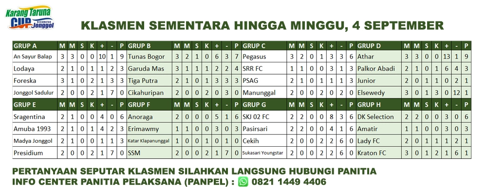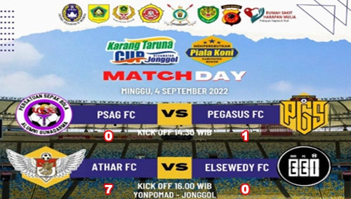 Memasuki hari ke-18 babak penyisihan grup, Tournament Sepakbola Akbar di Bogor Timur yang diselenggarakan oleh Karang Taruna Kecamatan Jonggol dengan nama Open Tournament Karang Taruna Kecamatan Jonggol Cup 2022, memperebutkan Piala KONI Kabupaten Bogor, kembali di hadirkan di Lapangan Sepakbola Puspomad Anoraga milik Yonpomad Jonggol, Minggu, 4 September 2022.