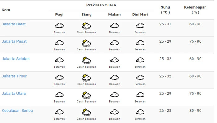 Untuk suhu udara pada hari ini berkisar antara 25 hingga 31 derajat celcius dengan kelembapan udara 60 hingga 90 persen.