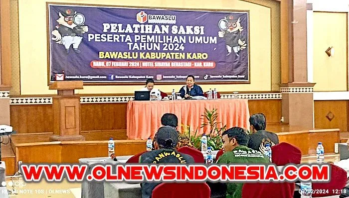Badan Pengawas Pemilihan Umum (Bawaslu) Kabupaten Karo laksanakan sosialisasi pelatihan saksi peserta Pemilihan Umum (Pemilu) tahun 2024 di aula hotel Sibayak Berastagi, Rabu, (07/02.2024) sekira pukul 10.30 WIB yang dihadiri oleh Panwaslu Kecamatan, KPU Kabupaten Karo, pengurus serta saksi masing-masing dari Partai Politik, dan awak media.