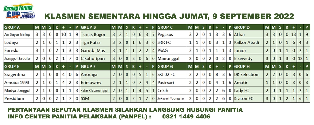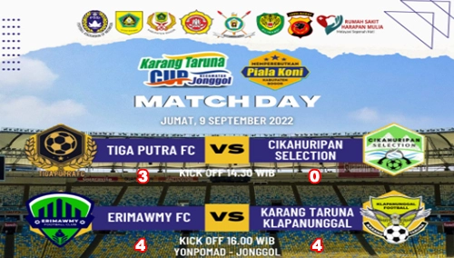 Memasuki hari ke-19 babak penyisihan grup, Tournament Sepakbola Akbar di Bogor Timur yang diselenggarakan oleh Karang Taruna Kecamatan Jonggol dengan nama Open Tournament Karang Taruna Kecamatan Jonggol Cup 2022, memperebutkan Piala KONI Kabupaten Bogor, kembali di hadirkan di Lapangan Sepakbola Puspomad Anoraga milik Yonpomad Jonggol, Jumat, 9 September 2022.