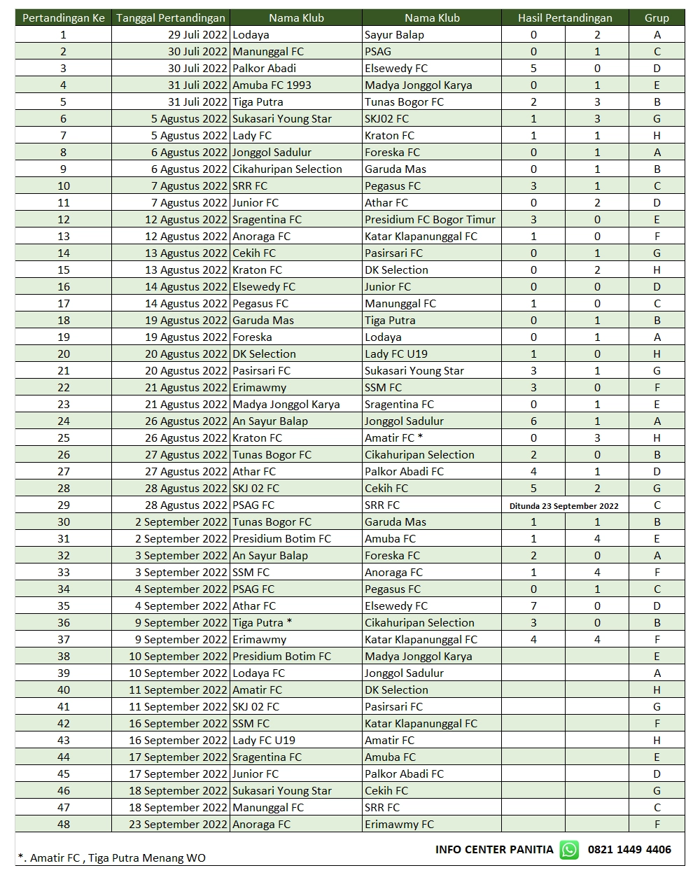 Pada pertandingan ke 36 dari grup B yang dipimpin Wasit Kibo, Tiga Putra Pasir Angin menang Walk Over (WO) atas Cikahuripan Selection atau dengan skor 3- 0. Dengan kemenangan ini Tiga Putra memastikan masuk ke babak 16 besar, menemani Tunas Bogor. Sementara Garuda Mas harus tersisih karena poin 4 milik mereka dilampaui oleh Tiga Putra. Sekaligus memastikan pertandingan di Grup B sudah diselesaikan semuanya.