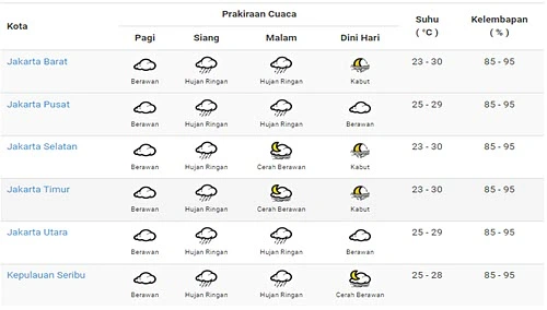 Untuk suhu udara pada hari ini berkisar antara 23 hingga 30 derajat celcius dengan kelembapan udara sekitar 85 – 95persen.