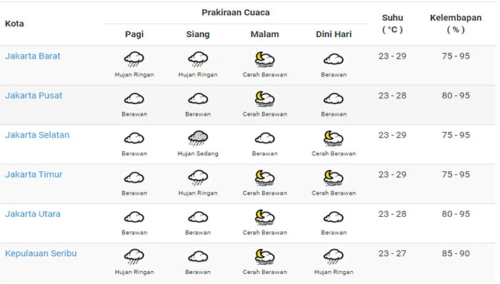 Badan Meteorologi, Klimatologi dan Geofisika (BMKG) memprakirakan, sebagian wilayah Jakarta akan berawan dan sebagian hujan ringan hingga sedang.