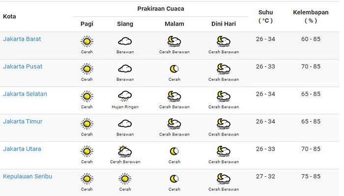 Badan Meteorologi, Klimatologi dan Geofisika (BMKG) memprakirakan, sebagian wilayah Jakarta akan cerah hingga hujan ringan.