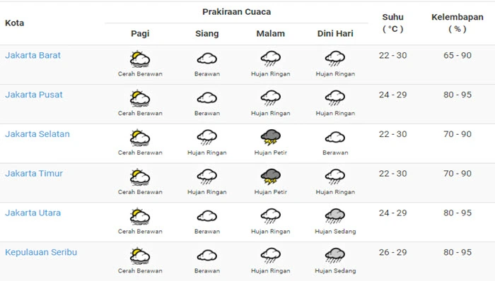 “Waspada potensi hujan disertai kilat/petir dan angin kencang di wilayah Jakbar, Jaksel, Jakut dan Jaktim pada malam dan dini hari” tulis BMKG melalui situs resminya pada Senin (13/3/23).