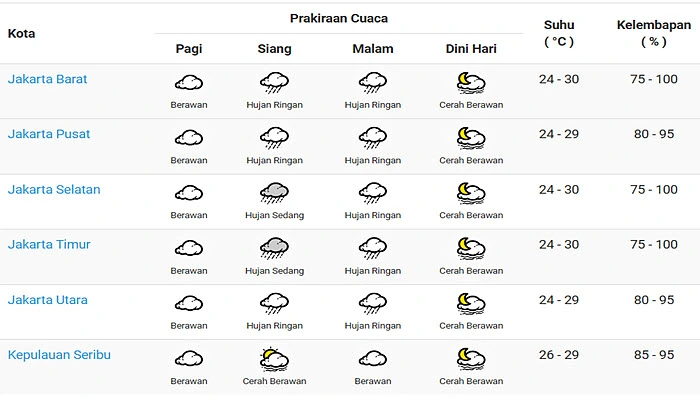 “Waspada potensi hujan disertai kilat/petir dan angin kencang di sebagian wilayah Jaksel, Jaktim, dan Jakbar pada sore hingga menjelang malam hari” tulis BMKG melalui situs resminya pada Rabu (14/6/23).