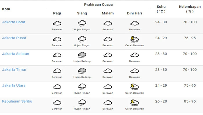 Badan Meteorologi, Klimatologi dan Geofisika (BMKG) memprakirakan, sebagian wilayah Jakarta akan cerah berawan hingga hujan.