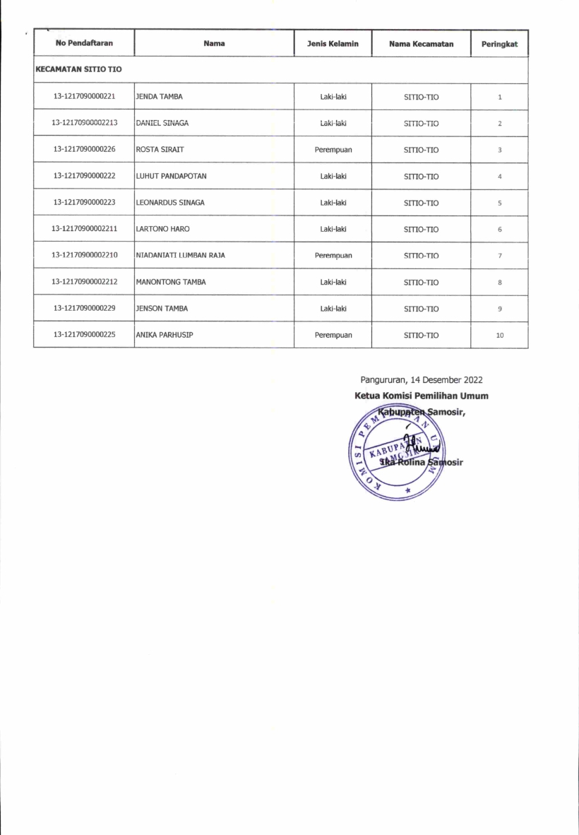 Berdasarkan berita acara rapat pleno Komisi Pemilhan Umum (KPU) Kabupaten Samosir mengeluarkan Surat Pengumuman Penetapan Hasil Seleksi Panitia Pemilihan Kecamatan Untuk Pemilu 2024 dengan Nomor Surat 429/PP.04.1-PU/1218/4/2022 dengan detail isi surat, tersebut dibawah