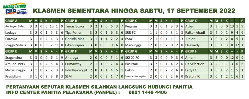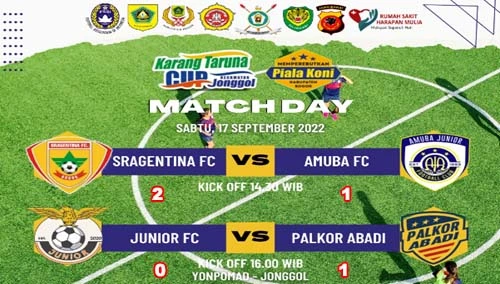 Memasuki hari ke-23 babak penyisihan grup, Tournament Sepakbola Akbar di Bogor Timur yang diselenggarakan oleh Karang Taruna Kecamatan Jonggol dengan nama Open Tournament Karang Taruna Kecamatan Jonggol Cup 2022, memperebutkan Piala KONI Kabupaten Bogor, kembali di hadirkan di Lapangan Sepakbola Puspomad Anoraga milik Yonpomad Jonggol, Sabtu, 17 September 2022.