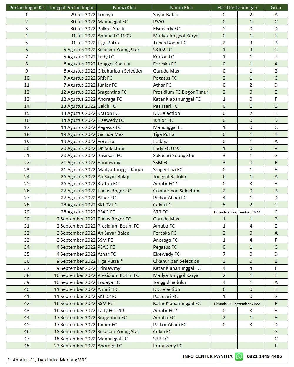 Untuk pertandingan di ke-22 kemarin pertandingan ke 42 antara SSM FC VS Katar Klapanunggal ditunda pada 24 September 2022. Sementara pertandingan kedua antar Lady FC VS Amatir FC dimenangkan dengan kemenangan WO 3-0 untuk Amatir FC karena Lady FC sampai waktu yang ditentukan tidak hadir sehingga Panpel maupun wasit memberikan kemenangan WO kepada Amatir FC yang sudah 2 kali memperoleh kemenangan tanpa bertanding yaitu melawan Kraton FC dan Lady FC kemarin.