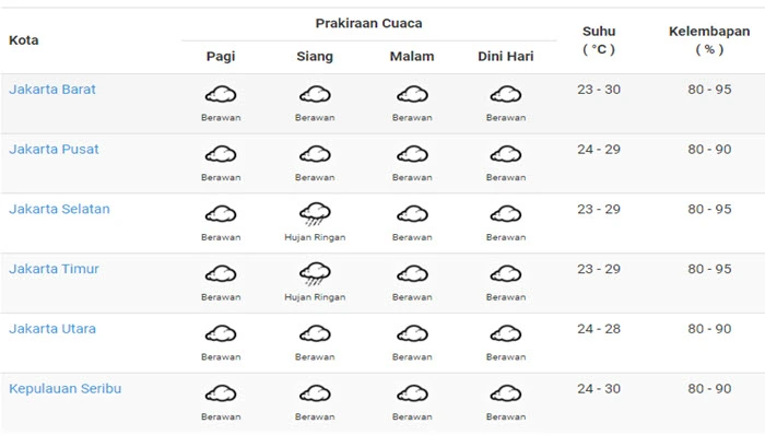 Badan Meteorologi, Klimatologi dan Geofisika (BMKG) memprakirakan, sebagian wilayah Jakarta akan berawan dan sebagian hujan ringan.