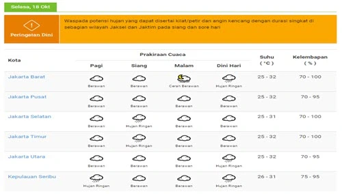 “Waspada potensi hujan yang dapat disertai kilat/petir dan angin kencang dengan durasi singkat di sebagian wilayah Jaksel dan Jaktim pada siang dan sore hari,” tulis BMKG dalam situsnya, Selasa (18/10).