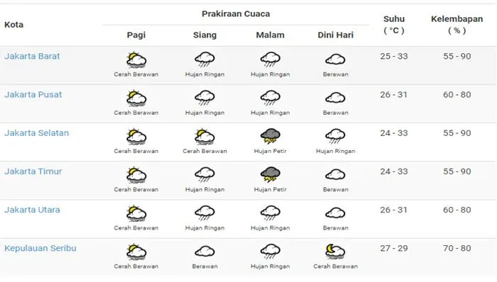 Badan Meteorologi, Klimatologi dan Geofisika (BMKG) memprakirakan wilayah Jakarta akan cerah berawan hingga hujan sedang.