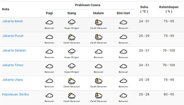 Badan Meteorologi, Klimatologi dan Geofisika (BMKG) memprakirakan, sebagian wilayah Jakarta cerah berawan hingga hujan ringan.