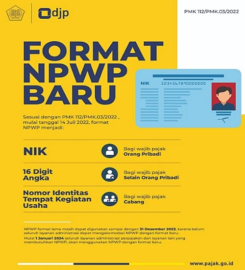 Setelah penggunaan Nomor Induk Kependudukan (NIK) sebagai Nomor Pokok Wajib Pajak (NPWP) secara resmi diluncurkan oleh Menteri Keuangan (Menkeu) Sri Mulyani Indrawati pada Acara Puncak Perayaan Hari Pajak Tahun 2022, Rabu (20/07/2022), penggunaan format baru NPWP kini diatur dalam Peraturan Menteri Keuangan (PMK) Nomor 112/PMK.03/2022.