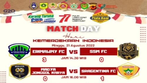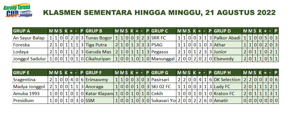 Memasuki hari ke-12 babak penyisihan grup, Tournament Sepakbola Akbar di Bogor Timur yang diselenggarakan oleh Karang Taruna Jonggol dengan nama Tournament Sepakbola Karang Taruna Jonggol Cup 2022, memperebutkan Piala KONI Kabupaten Bogor, kembali dilanjutkan di Lapangan Sepakbola Puspomad Anoraga milik Yonpomad Jonggol, Minggu, 21 Agustus 2022.