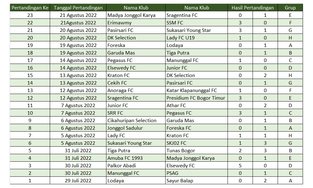 Dengan hasil ini maka Sragentina memastikan mengantongi tiket masuk ke babak 16 besar. Dengan 2 kemenangan, pertama melawan Presidium dan hari ini melawan Madya Jonggol Karya, maka Sragentina memiliki poin sempurna dengan nilai 6. Disusul oleh Madya Jonggol Karya di posisi kedua, pada posisi ketiga dan empat berturut-turut ditempati oleh Amuba 1993 dan Presidium FC Bogor Timur.