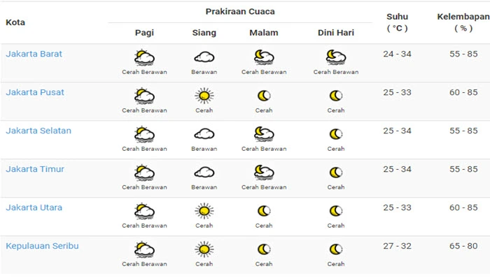 Badan Meteorologi, Klimatologi dan Geofisika (BMKG) memprakirakan wilayah Jakarta akan cerah hingga cerah berawan.