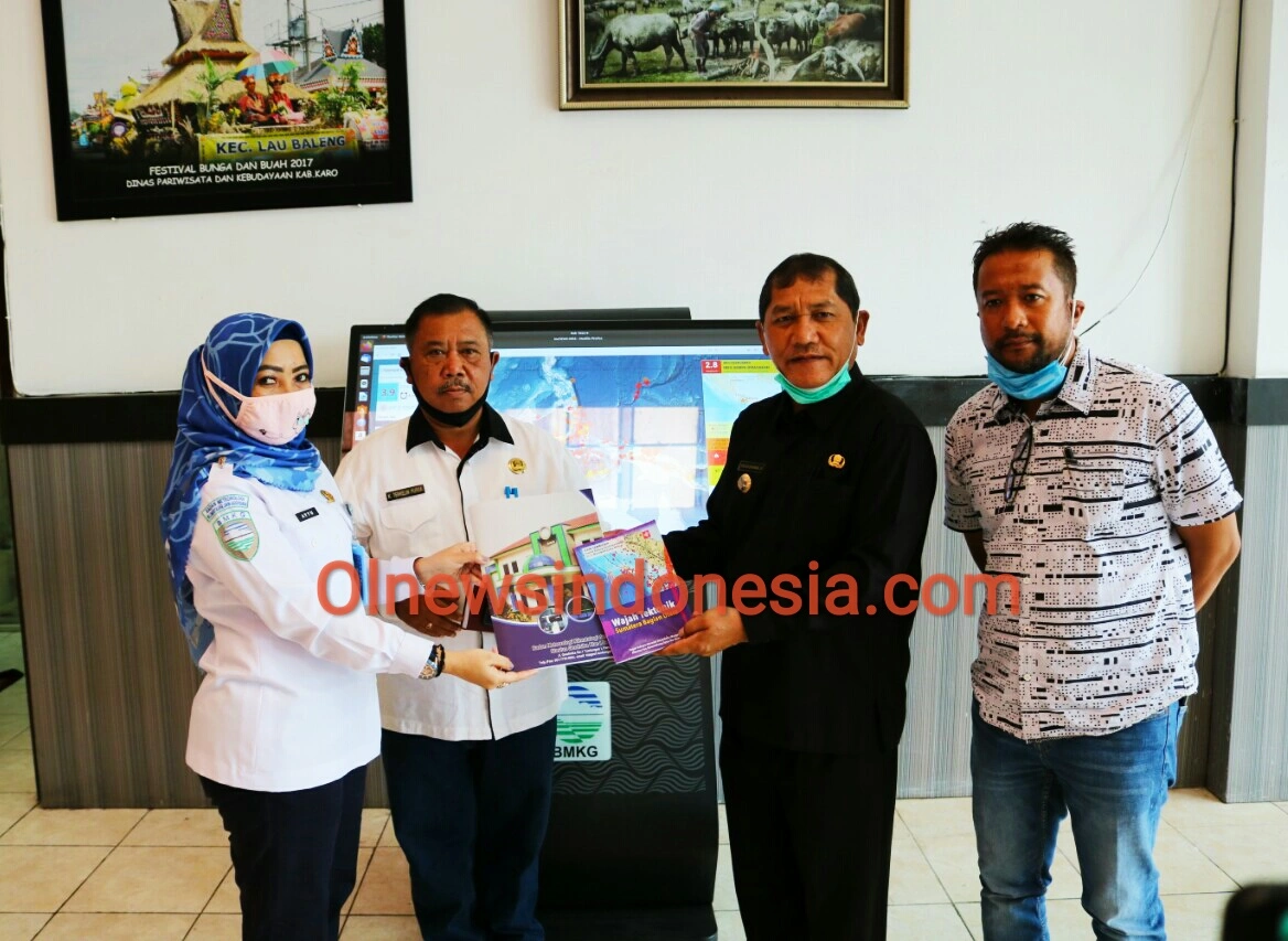 Ket foto : Bupati Karo Terkelin Brahmana SH MH saat menerima dokumen dari Kepala Stasiun Geofisika Deli Serdang Ibu Teguh Rahayu terkait pemasangan alat pendeteksi dini gempa bumi dan tsunami di Lobi Kantor Bupati Karo, Rabu (22/07) 2020 (Ist)