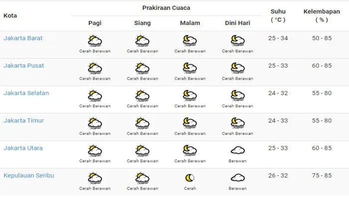 Badan Meteorologi, Klimatologi dan Geofisika (BMKG) memprakirakan wilayah Jakarta akan cerah hingga cerah berawan.
