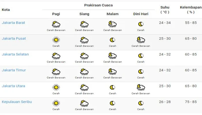 Badan Meteorologi, Klimatologi dan Geofisika (BMKG) memprakirakan wilayah Jakarta akan cerah hingga cerah berawan.