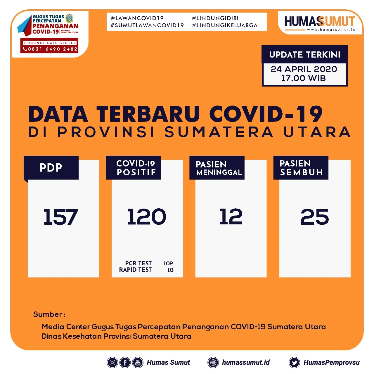 Berikut adalah data perkembangan pasien Virus Corona (Covid-19) di Provinsi Sumatera Utara (Sumut) hingga pukul 17.00 WIB Jum’at tanggal 24 April 2020 , sebagaimana yang disampaikan Juru Bicara Gugus Tugas Percepatan Penanganan Covid-19 Sumatera Utara, dr. Aris Yudhariansyah, MM melalui Wa AKBP Donald Simanjuntak.
