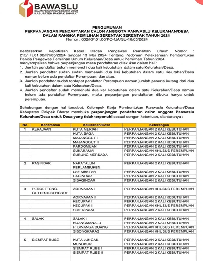 Badan Pengawas Pemilu (Bawaslu) Kabupaten Pakpak Bharat, memperpanjang pendaftaran calon anggota Panitia Pengawas Pemilu Kelurahan/Desa (PKD) dalam rangka untuk pemilihan serentak Tahun 2024.