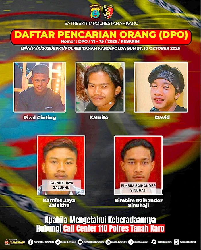 Satuan Reserse Kriminal (Satreskrim) Polres Tanah Karo resmi menerbitkan Daftar Pencarian Orang (DPO) terhadap lima terduga Pelaku tindak pidana diwilayah hukum (Wilkum) Polres Tanah Karo. Yang mana penerbitan DPO tersebut tercantum dalam Nomor: DPO/71–75/2025/RESKRIM, berdasarkan LP/A/14/X/2025/SPKT/POLRES TANAH KARO/POLDA SUMUT yang dikeluarkan pada 10 Oktober 2025.