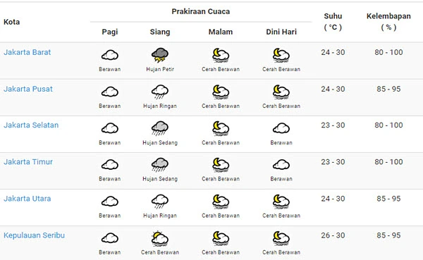 Badan Meteorologi, Klimatologi dan Geofisika (BMKG) memprakirakan, mayoritas wilayah Jakarta akan diguyur hujan dengan intensitas tinggi hingga ringan.