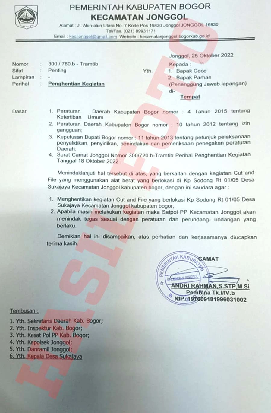 Satuan Polisi Pamong Praja (Satpol PP) Kecamatan Jonggol melalui Kasi Ketentraman dan Ketertiban (Tramtib), bekerjasama dengan Pemerintah Desa Sukajaya beserta aparatnya serta dan didukung Babinmas Polsek Jonggol dan Babinsa Koramil 2107, RT/RW sekitar lokasi melakukan penghentian kegiatan cut and file di Kampung Sodong, RT 01/05, Desa Sukajaya, Kecamatan Jonggol, Kabupaten Bogor.