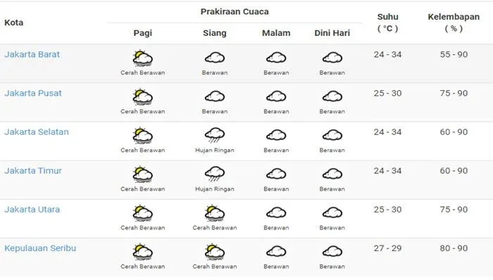 Badan Meteorologi, Klimatologi dan Geofisika (BMKG) memprakirakan wilayah Jakarta akan cerah berawan hingga hujan ringan.