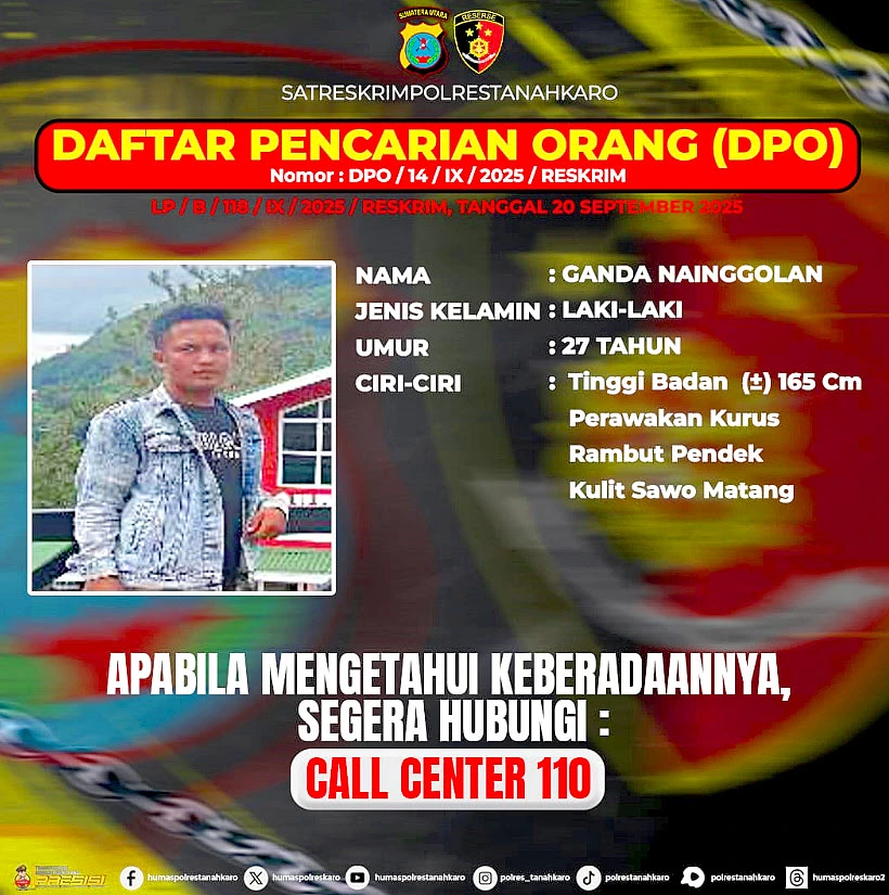 Menindak lanjuti kasus penemuan mayat MR.Perangin-angin (32) di areal Perladangan Seledang, Desa Ndokum Siroga, Kecamatan Simpang Empat, Satreskrim Polres Tanah Karo secara resmi menerbitkan Daftar Pencarian Orang (DPO) terhadap seorang pria bernama Ganda Nainggolan (27), warga Desa Surbakti, Kecamatan Simpang Empat.