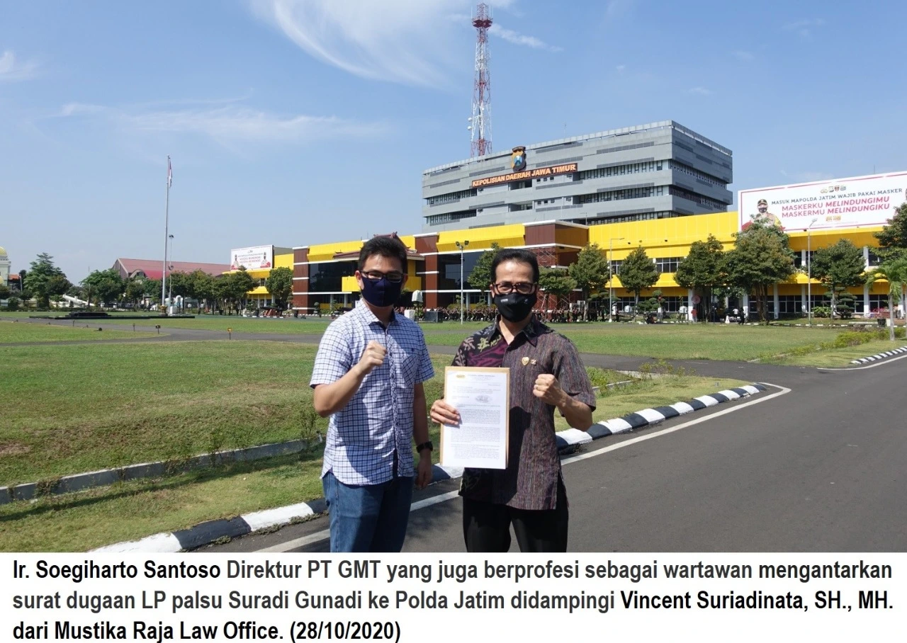 Hoky pun menceritakan kronologis perjalanan kasus yang dilaporkannya sejak 15 Maret 2018, dimana pada tanggal 23 Oktober  2018 Suradi sudah ditetapkan sebagai tersangka dan sempat ditahan di Rutan Salemba Jakarta. Dan anehnya, bukannya jerah, Suradi malah diduga membuat laporan palsu di Polda Jatim pada tanggal 28 September 2019 untuk mengkriminalisasi pihak PT GMT. “Kami tentunya melakukan perlawanan dengan melayangkan surat kepada pihak Polda Jatim tentang dugaan laporan palsu tersebut,†ujarnya.