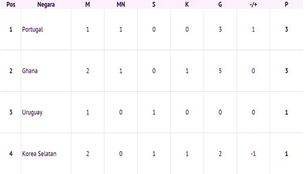 Hasil ini membuat Korea Selatan berada di dasar klasemen Grup H Piala Dunia 2022 dengan raihan satu angka dari dua laga. Sementara Ghana naik ke peringkat kedua dengan koleksi tiga angka.