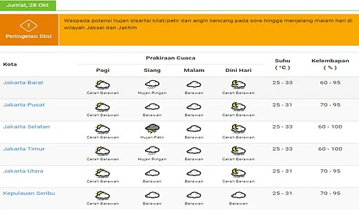 “Waspada potensi hujan disertai kilat/petir dan angin kencang pada sore hingga menjelang malam hari di wilayah Jaksel dan Jaktim (28/10).