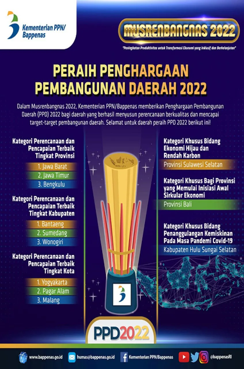 Pada Musrenbangnas 2022, Kementerian PPN/Bappenas memberikan apresiasi Penghargaan Pembangunan Daerah (PPD) 2022, dan terlampir dalam gambar dibawah ini adalah pemenangnya.