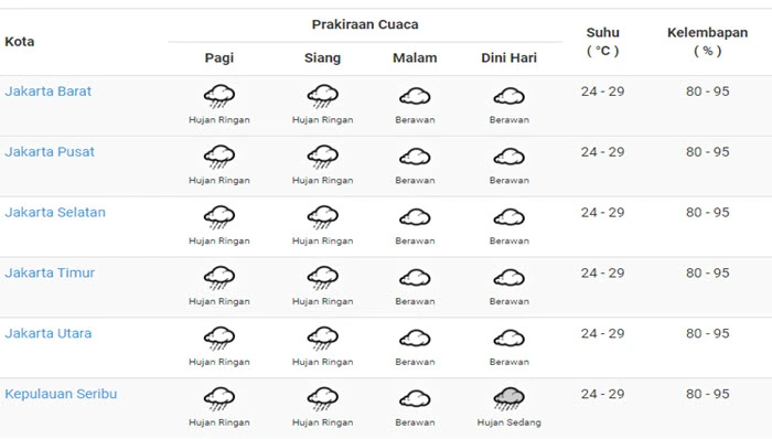 “Waspada potensi hujan disertai kilat/petir dan angin kencang di wilayah Jakut, Jaksel, Jakbar, dan Jaktim pada pagi dan sore hari” tulis BMKG pada situs resminya pada Rabu (29/3/2023).