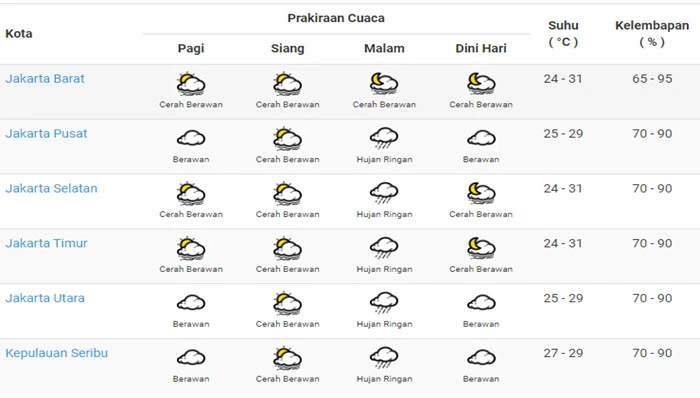 Badan Meteorologi, Klimatologi dan Geofisika (BMKG) memprakirakan, sebagian wilayah Jakarta akan cerah berawan hingga hujan ringan.