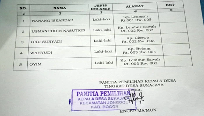 Dalam penetapan tahapan ini, Camat Jonggol, Andri Rahman S.STP, M.Si didampingi Ketua Badan Permusyawaratan Desa (BPD) Yudi Irawan, serta Kepala Desa Sukajaya, Ujang Royani menyaksikan langsung proses penetapan 5 bakal calon yang ditetapkan menjadi calon, diantaranya :