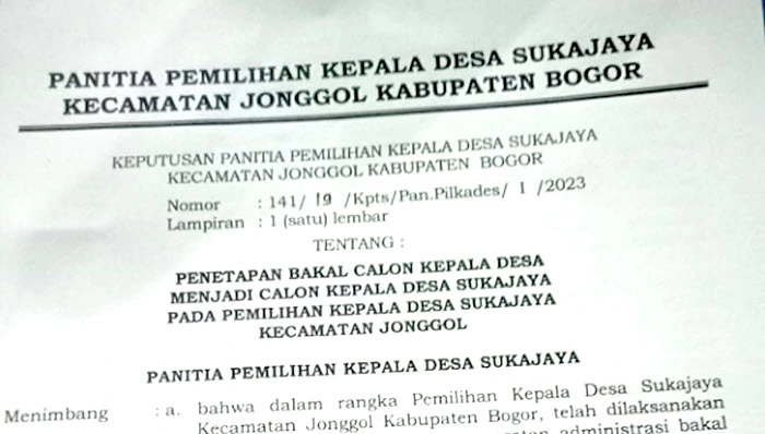 Panitia Pemilihan Kepala Desa (Pilkades) Sukajaya, dipimpin langsung Ketuanya Encep Ma’mun menggelar tahapan penetapan Bakal Calon (Balon) menjadi Calon Kepala Desa Sukajaya pada Senin, 30 Januari 2023, bertempat di Aula Desa Sukajaya, yang dimulai pukul 14.00 WIB sampai dengan selesai.